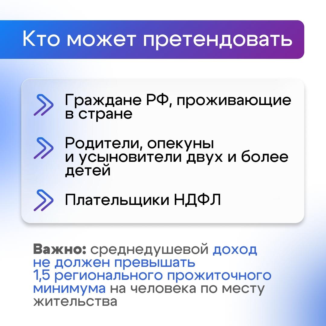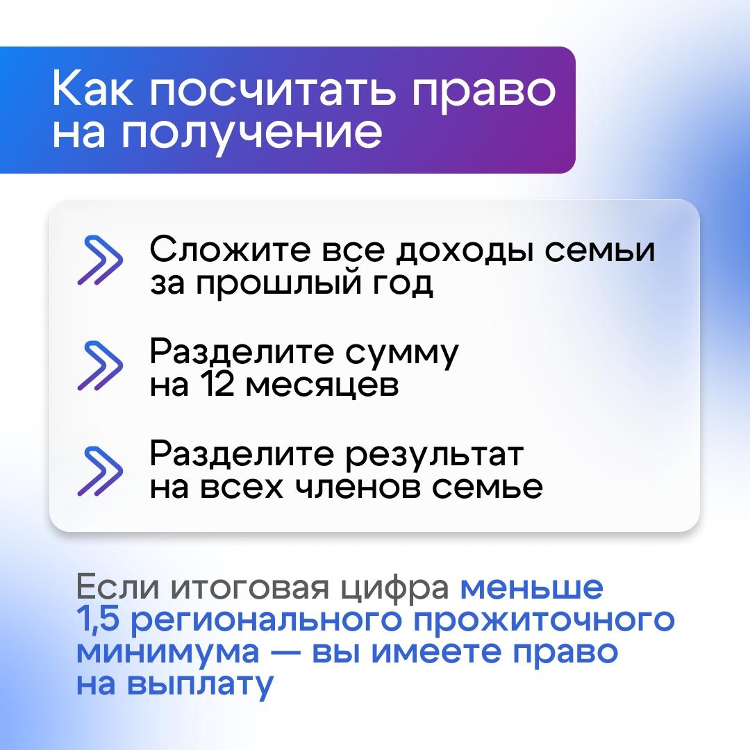 Важно: размер среднедушевого дохода семьи не должен превышать 1,5-кратную величину прожиточного минимума на человека в 2025 году по месту жительства. В нашем регионе в разных территориях он разный. Например, в Красноярске он равен 27 937,50 руб., а в Норильске – 41 572,50 руб. на одного члена семьи.